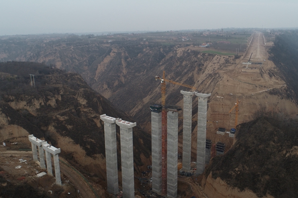 新城溝大橋作為項目控制性工程,長度不到400m的深溝內作業(yè)面狹小,附近便道又陡又窄,人員、機械、材料運輸困難,溝中的10個空心薄壁墩最高達到78米。為做到“又好又快”施工,技術人員經(jīng)過調查和方案比選,采用翻模施工工藝與高墩自動噴淋養(yǎng)生技術,在保證工期的同時做到墩身外觀質量及實體強度滿足設計要求。過程中,大家克服數(shù)道難關,鉚足了勁與時間賽跑,提前完成橋梁下構施工任務,為后續(xù)架梁和橋面系施工贏得了有效時間。