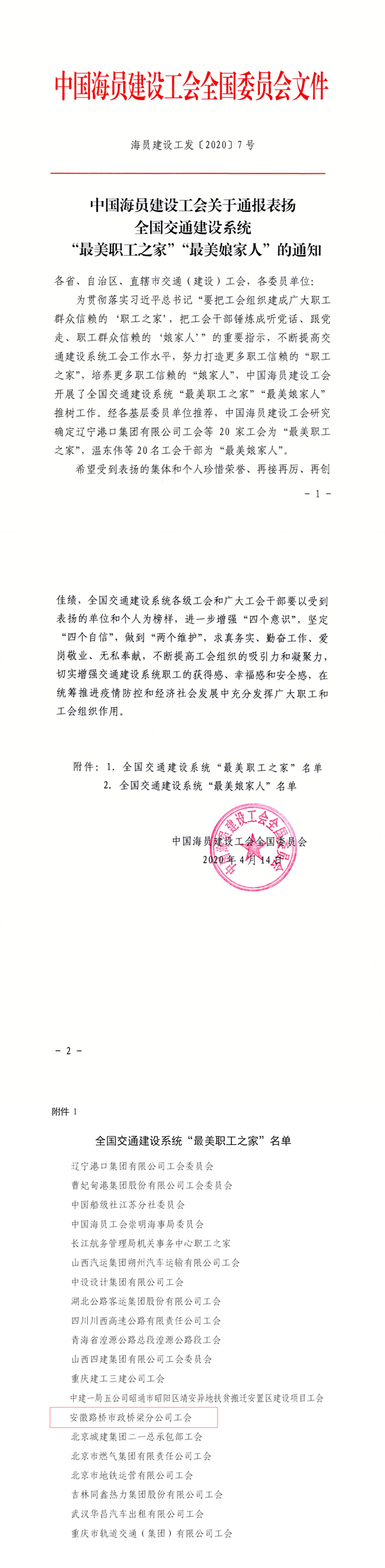 近日,中國(guó)海員建設(shè)工會(huì)全國(guó)委員會(huì)下發(fā)通知,通報(bào)了全國(guó)交通建設(shè)系統(tǒng)“最美職工之家”評(píng)選結(jié)果,市政分公司工會(huì)成為安徽省唯一一家獲此殊榮的基層工會(huì)。