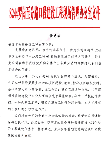 近日,六安市S244羅崗至分路口段建設(shè)工程現(xiàn)場辦發(fā)來表揚信,對公司承建的03標項目順利完成前期各項任務(wù)給予高度認可并通報表揚。