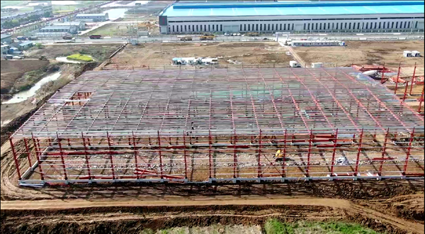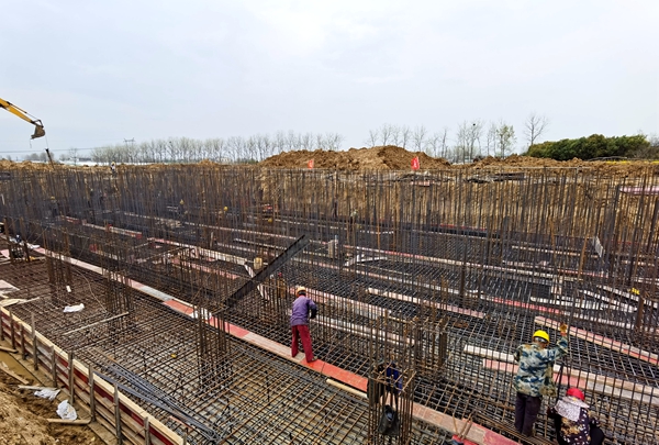 2021年1月4日,在基地藍圖繪就的基礎(chǔ)上,廠房和辦公生活設(shè)施項目部進場施工。他們克服了土地征收、連續(xù)多雨天氣、拆遷困難、樹木砍伐等不利因素,發(fā)揚“特別能吃苦、特別能戰(zhàn)斗”的企業(yè)作風,解決了一個又一個棘手的問題,加班加點推進基地基礎(chǔ)設(shè)施建設(shè)。截至3月底,吳山產(chǎn)業(yè)化基地項目3#管片生產(chǎn)車間地基基礎(chǔ)、短柱、框梁施工完成100%;3#管片生產(chǎn)車間鋼柱、鋼梁等主體結(jié)構(gòu)安裝完成70%,拌合站主機、粉煤灰罐基礎(chǔ)完成100%。