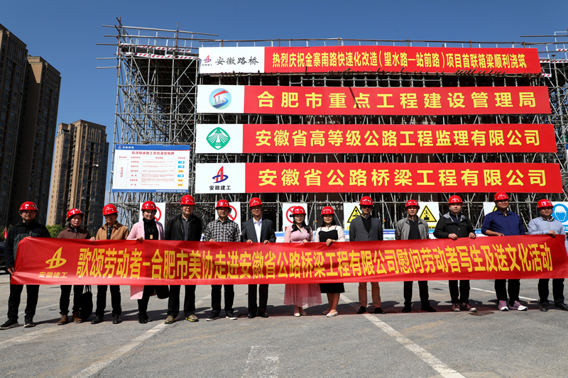 4月26日下午,合肥市美協(xié)、市書畫院開展的“歌頌勞動者——安徽省公路橋梁工程有限公司慰問勞動者、寫生及送文化”活動走進金寨南路(站前路-深圳路)快速化改造項目-1標(biāo)段項目。合肥市書畫院院長邵鑫,合肥市美協(xié)副主席、秘書長胡玉,合肥市美協(xié)副主席、書畫院副院長周建祥,合肥市美協(xié)副主席韓一民等參加。