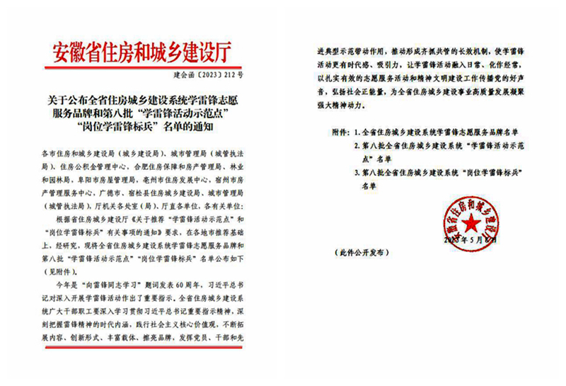 近日,安徽省住房和城鄉(xiāng)建設(shè)廳公布了第八批全省住房城鄉(xiāng)建設(shè)系統(tǒng)“崗位學(xué)雷鋒標(biāo)兵”名單,表彰一批樂于奉獻(xiàn)、自覺踐行雷鋒精神的崗位標(biāo)兵。公司職工石懷遠(yuǎn)、趙玉珠獲此殊榮。