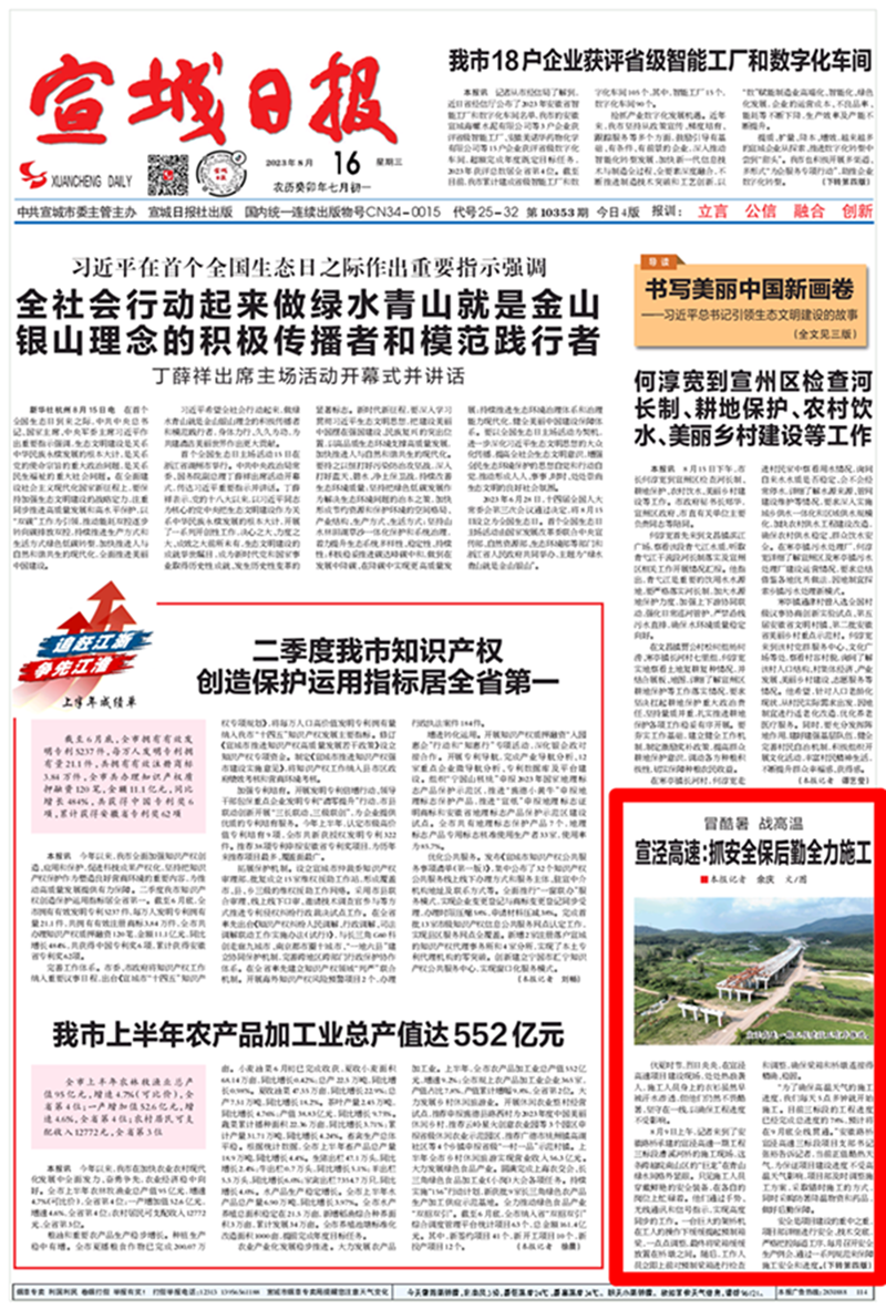 【名媒聚焦】宣城日報——冒酷暑 戰(zhàn)高溫 安徽路橋宣涇高速:抓安全保后勤全力施工