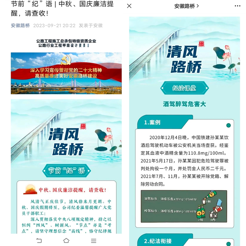 9月,公司陸續(xù)推出《紀法課堂|酒駕醉駕危害大》、《節(jié)前“紀”語|中秋、國慶廉潔提醒》,并組織學習中紀委、省紀委近期公開曝光的違反中央八項規(guī)定精神問題典型案例,向全體黨員干部發(fā)送廉潔過節(jié)提醒短信。中秋、國慶前,公司紀委通過微信公眾號、手機短信等形式密集推送廉潔提醒信息,重申節(jié)日紀律要求,做實作風建設思想和紀律教育,早打招呼、早提醒。引導帶動各級黨組織通過“三會一課”、主題黨日等,把全面從嚴治黨、加強節(jié)點作風建設要求傳達到每一名黨員干部。市政分公司組織赴包公故里文化園開展“筑防線葆廉潔本色 揚正氣創(chuàng)清風路橋”主題黨日活動;橋梁分公司、軌道分公司逐級對關鍵崗位人員開展廉潔從業(yè)談心談話,持續(xù)提高黨員干部紀律規(guī)矩意識。時刻繃緊紀律規(guī)矩之弦,對標作風建設紀律規(guī)矩檢視律己,守紀律、知敬畏、過“廉”節(jié)。