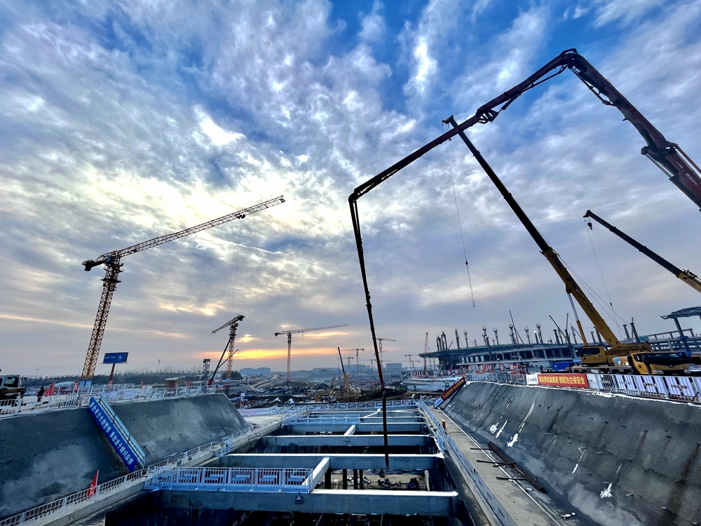 12月23日下午,合肥新橋國際機(jī)場綜合交通中心項目歷經(jīng)約10小時的鏖戰(zhàn),圓滿完成項目地鐵S1線首塊底板澆筑。