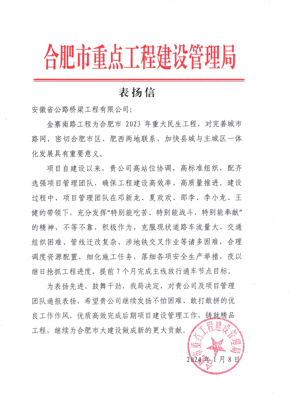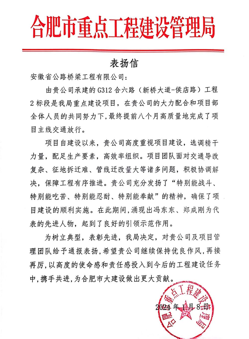 近日,公司承建的G312合六路(新橋大道-侯店路)工程2標(biāo)、金寨南路快速化改造(望水路-站前路)項目、金寨南路快速化改造工程(站前路—深圳路)1標(biāo)項目收到合肥市重點局來信表揚。