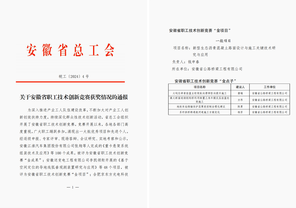 近日,安徽省總工會發(fā)布《關于安徽省職工技術(shù)創(chuàng)新競賽獲獎情況的通報》,公司報送的《新型生態(tài)瀝青混凝土路面設計與施工關鍵技術(shù)研究與應用》獲評“金項目”,《大噸位牽索掛籃主桁架縱向滑移豎向提升施工》等4項建議獲評“金點子”。