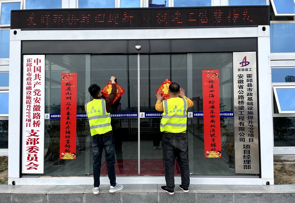 春節(jié)期間,霍邱縣市政基礎(chǔ)設(shè)施提升PPP項(xiàng)目值守人員與工友為項(xiàng)目門(mén)窗貼上春聯(lián)、福字,大家一起準(zhǔn)備了年夜飯,共度佳節(jié),感受別樣的家的溫暖。