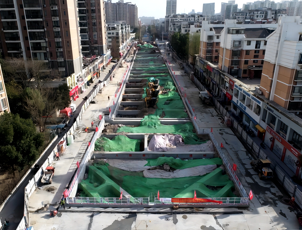 史河路站位于青陽路與史河路交口,地處老城區(qū),周邊小區(qū)密集、地下管線錯(cuò)綜復(fù)雜且存在高強(qiáng)度中風(fēng)化砂巖,作業(yè)空間非常有限,施工體量大、難度高。項(xiàng)目部提前編制開挖方案、組織專家論證、多次召開專項(xiàng)技術(shù)交底會(huì),嚴(yán)格做好施工及安全工作交底、管控,并積極與街道、社區(qū)溝通協(xié)調(diào),保障了施工順利推進(jìn)。