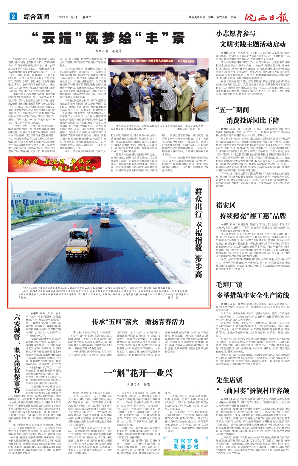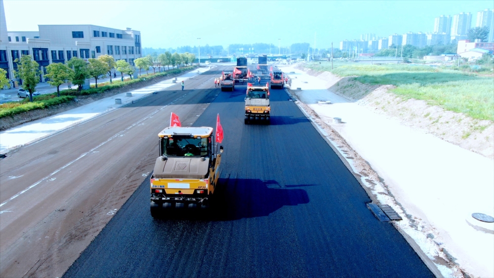 5月3日,在霍邱縣蓼東大道施工現(xiàn)場,工人們正進行安陽山路至五岳路段下面層瀝青攤鋪工作,一輛輛運料車、攤鋪機、壓路機來回穿梭。