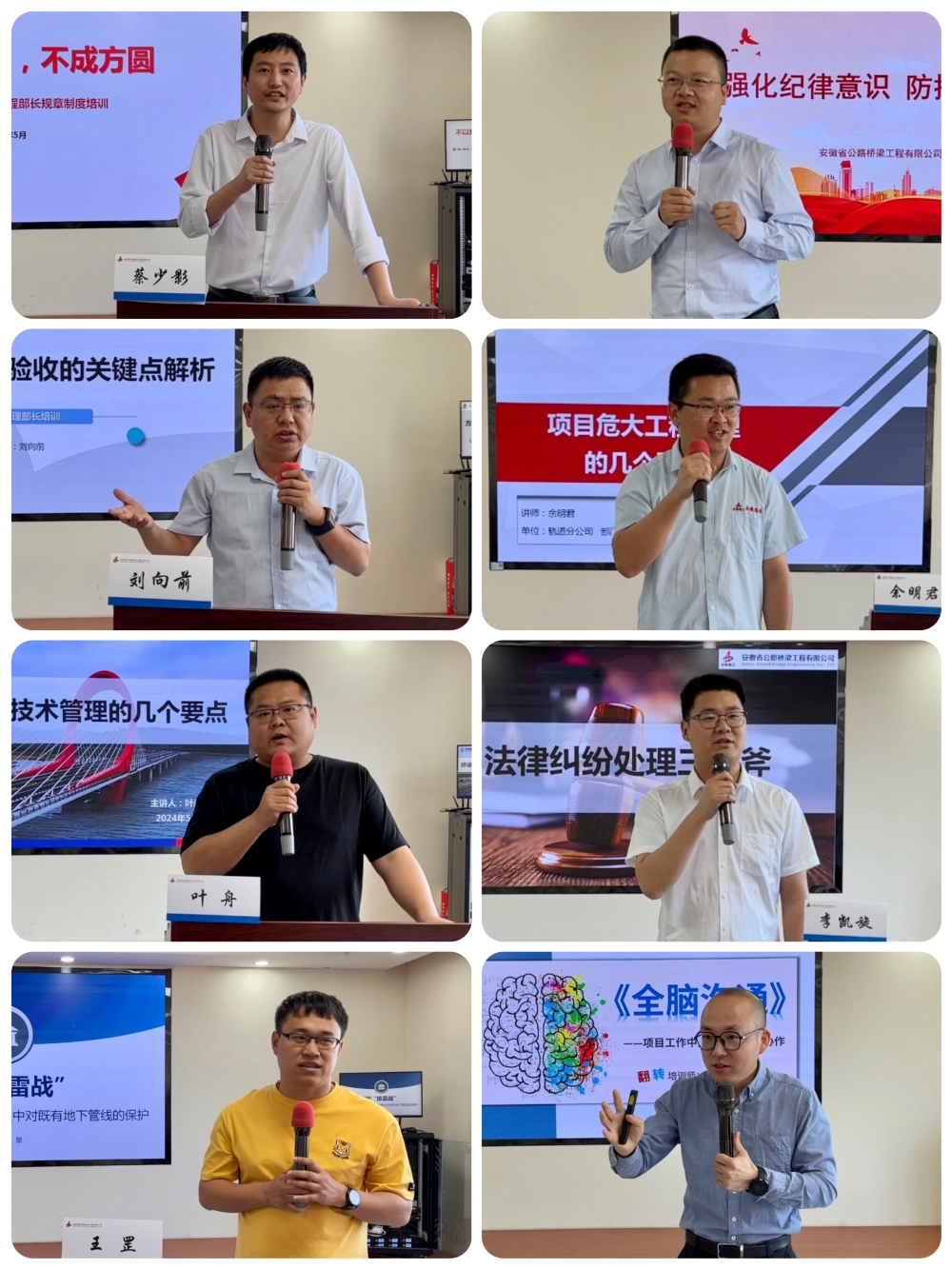 培訓采用新老講師結合的形式,內(nèi)容涉及公司最新規(guī)章制度解析、方案編制和檢查驗收、橋梁工程施工技術、地下管線保護、項目危大工程、廉潔教育、法律糾紛處理以及通用管理課程等。