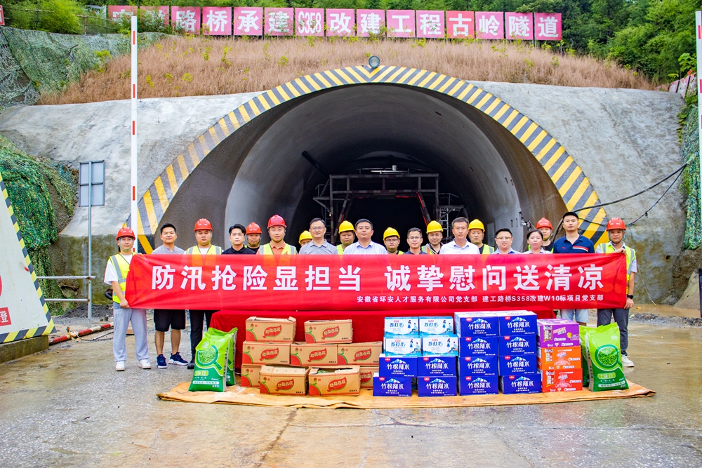 7月14日下午,共青團池州市委副書記、市青聯(lián)主席蔣業(yè)健帶隊到公司承建的S358改建W10標古嶺隧道施工現(xiàn)場,開展“防汛搶險顯擔當 誠摯慰問送清涼”活動,看望慰問奮戰(zhàn)在施工一線的建設者們,叮囑要科學安排施工和休息時間,并送來防暑降溫物資。