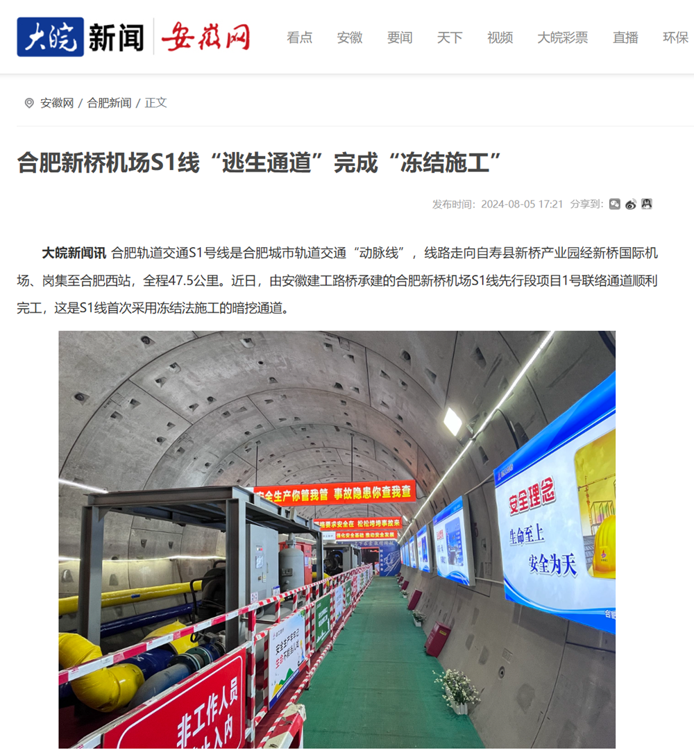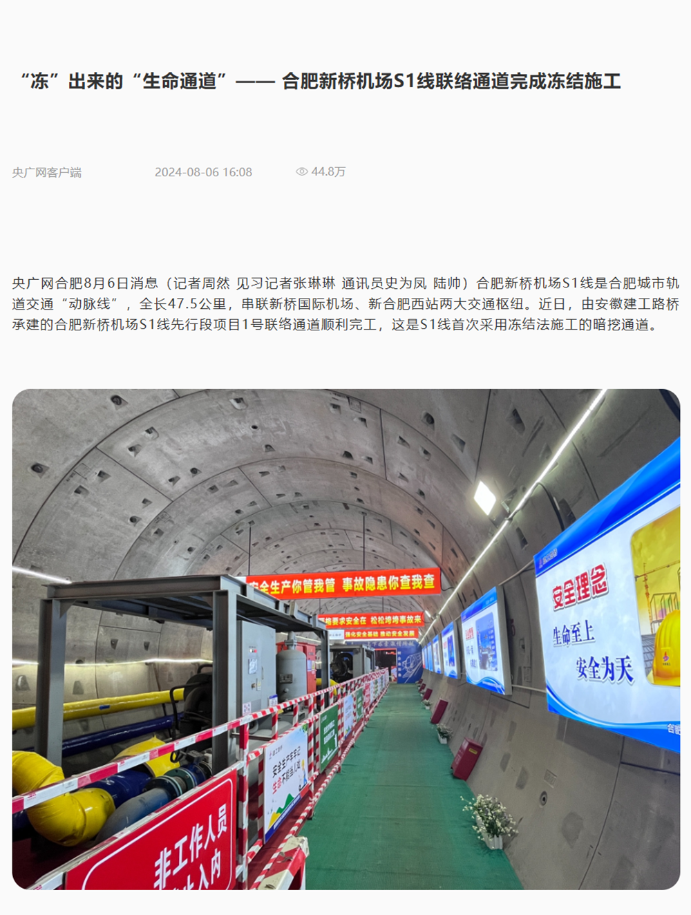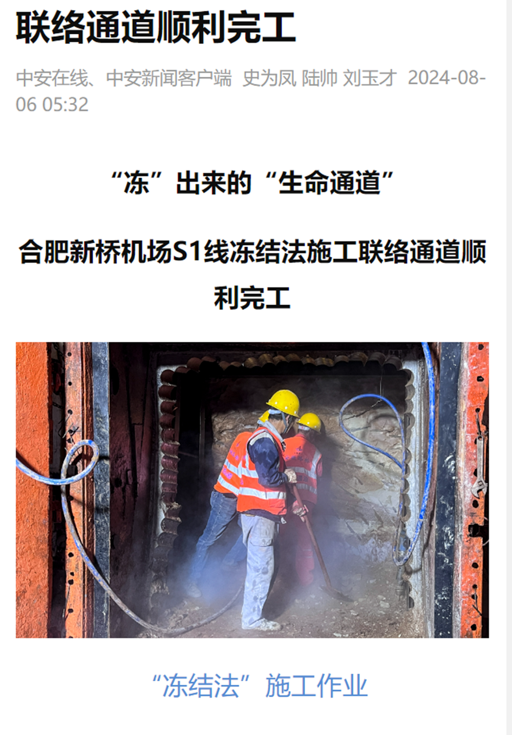 【名媒聚焦】央廣網(wǎng)、中安在線、大皖新聞:“凍”出來的“生命通道”——合肥新橋機(jī)場(chǎng)S1線凍結(jié)法施工聯(lián)絡(luò)通道順利完工