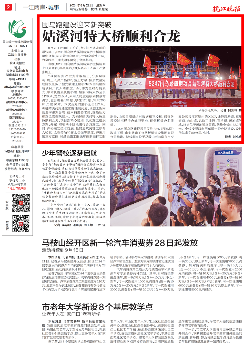 S247(圍烏路)改建工程全長52公里,是馬鞍山市東部區(qū)域重要的南北方向快速通道,也是該市“五橫六縱二聯(lián)”主干公路網(wǎng)中的縱六線。項(xiàng)目建成通車后,將進(jìn)一步加強(qiáng)馬鞍山與各城鎮(zhèn)之間的溝通聯(lián)結(jié),提高綜合運(yùn)輸網(wǎng)的服務(wù)水平,帶動(dòng)大青山等周邊旅游資源的開發(fā),促進(jìn)與南京都市圈及長三角核心區(qū)域人流、物流、資金流、信息流的充分流動(dòng),對(duì)加快推進(jìn)寧馬一體化、等高對(duì)接南京都市圈,推動(dòng)沿線地區(qū)乃至全市經(jīng)濟(jì)高質(zhì)量發(fā)展具有重要意義。