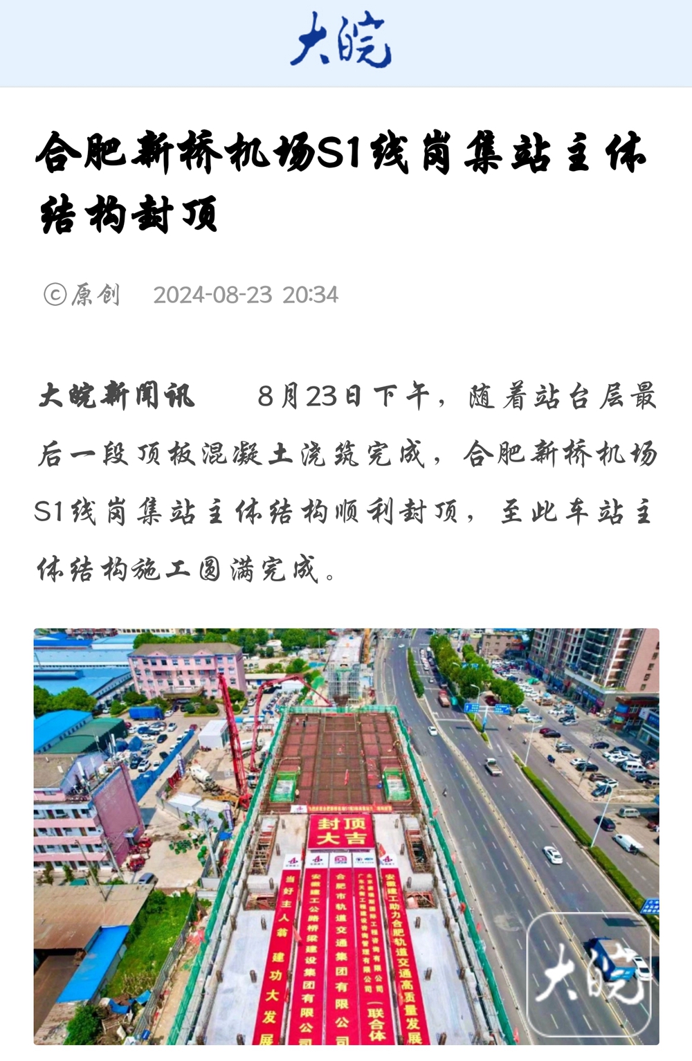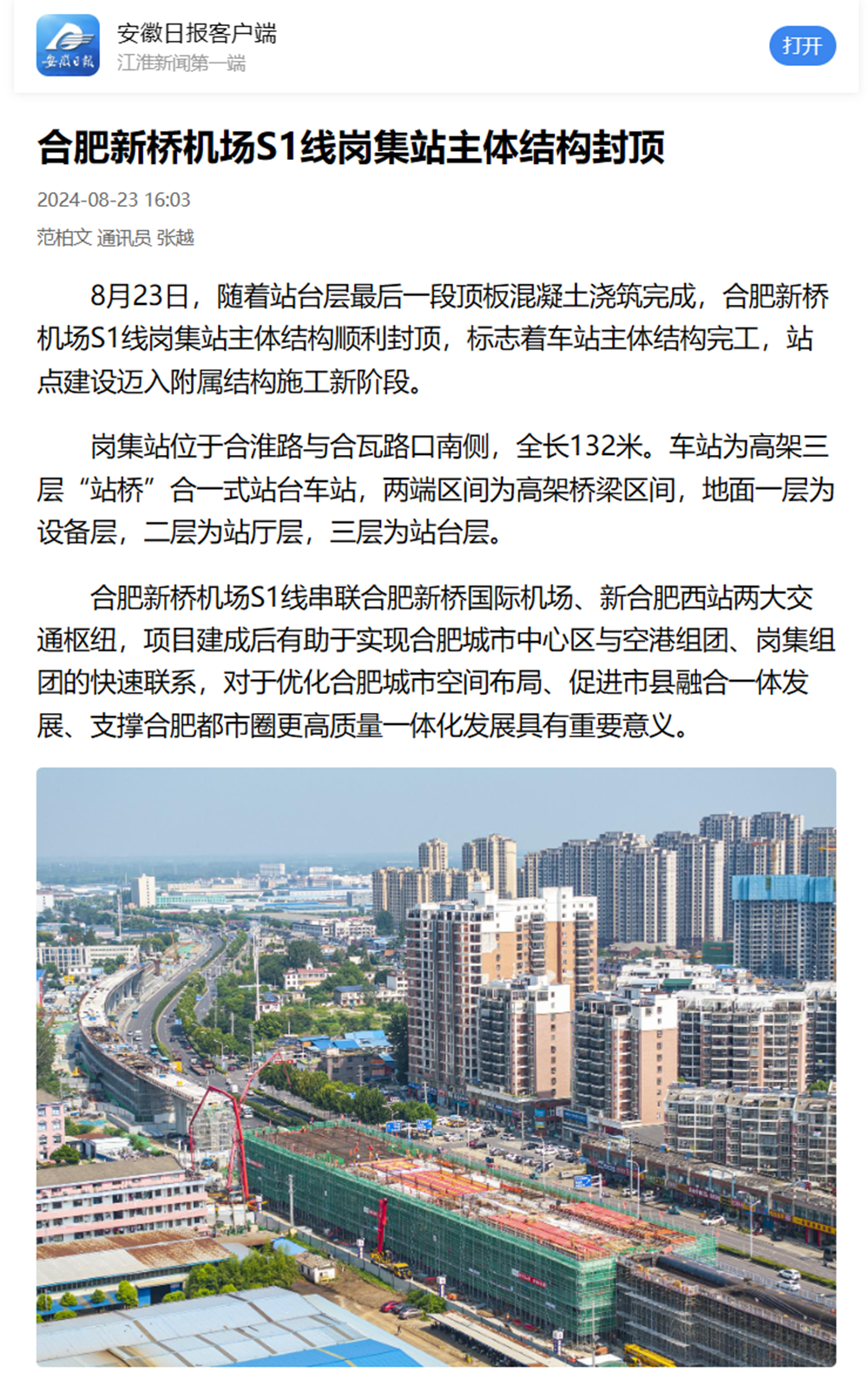 【名媒聚焦】央廣網(wǎng)、中安在線、安徽日報等主流媒體聚焦合肥新橋機(jī)場S1線項(xiàng)目崗集站主體結(jié)構(gòu)封頂