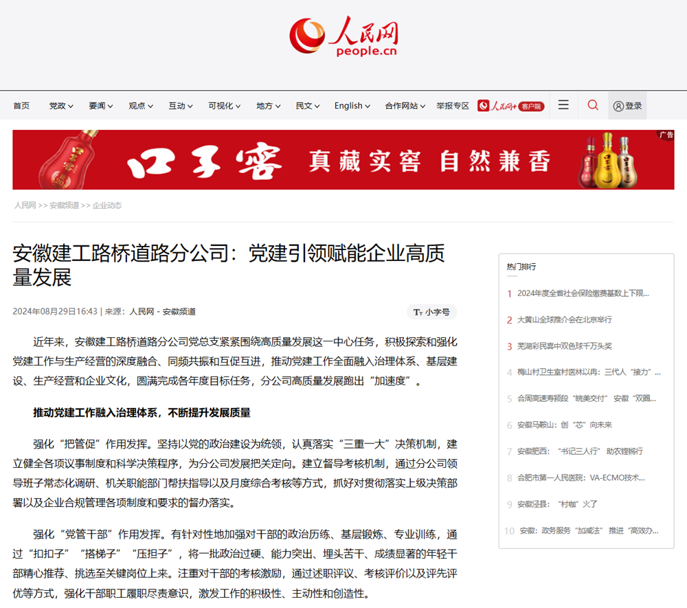 【名媒聚焦】人民網——安徽建工路橋道路分公司:黨建引領賦能企業(yè)高質量發(fā)展