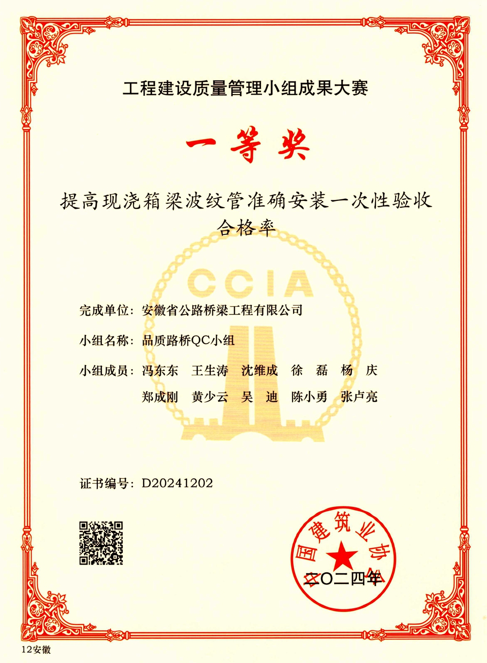 本次QC決賽共發(fā)布751項(xiàng)成果。公司推薦的《提高索導(dǎo)管定位安裝一次性驗(yàn)收合格率》《提高現(xiàn)澆箱梁波紋管準(zhǔn)確安裝一次性驗(yàn)收合格率》2項(xiàng)QC成果獲一等獎(jiǎng),《提高大直徑鋼筋直螺紋連接一次施工合格率》Q(chēng)C成果獲得二等獎(jiǎng)。