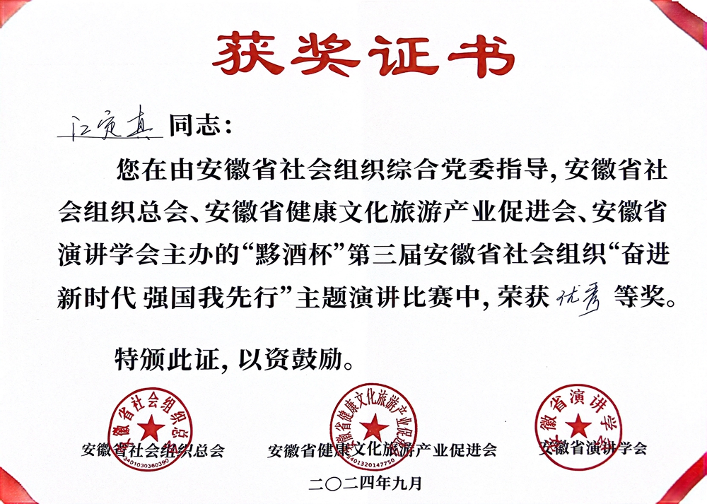 9月21日,第三屆安徽省社會組織“奮進(jìn)新時代 強(qiáng)國我先行”主題演講比賽復(fù)賽、決賽在合肥舉行,公司選送參賽選手江定真參加角逐,經(jīng)過激烈比拼,榮獲優(yōu)秀獎。