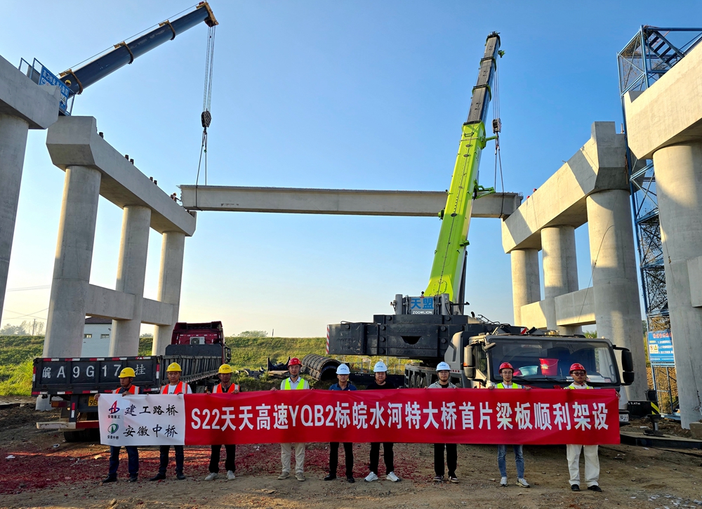 在S22天天高速YQB2標關(guān)鍵控制性工程——皖水河特大橋施工現(xiàn)場,項目部緊盯施工節(jié)點,壓實責任抓落實,順利完成首片預制箱梁架設(shè)。