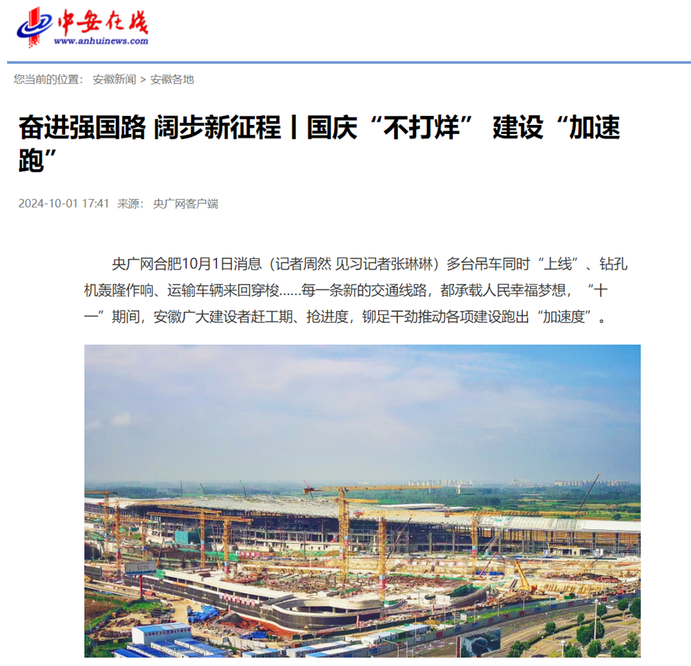 國(guó)慶假期,公司所屬各重點(diǎn)項(xiàng)目“不打烊”,推動(dòng)項(xiàng)目建設(shè)“加速跑”,受到中央廣播電視總臺(tái)、新華社、央廣網(wǎng)、安徽衛(wèi)視、中安在線等國(guó)家和省部級(jí)主流媒體聚焦報(bào)道。