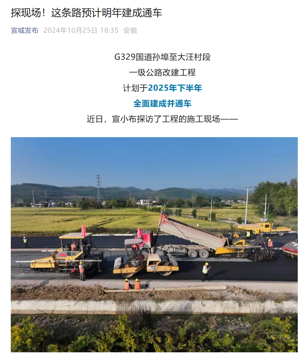 10月25日,《宣城發(fā)布》對(duì)G329改建工程項(xiàng)目建設(shè)情況進(jìn)行了報(bào)道。