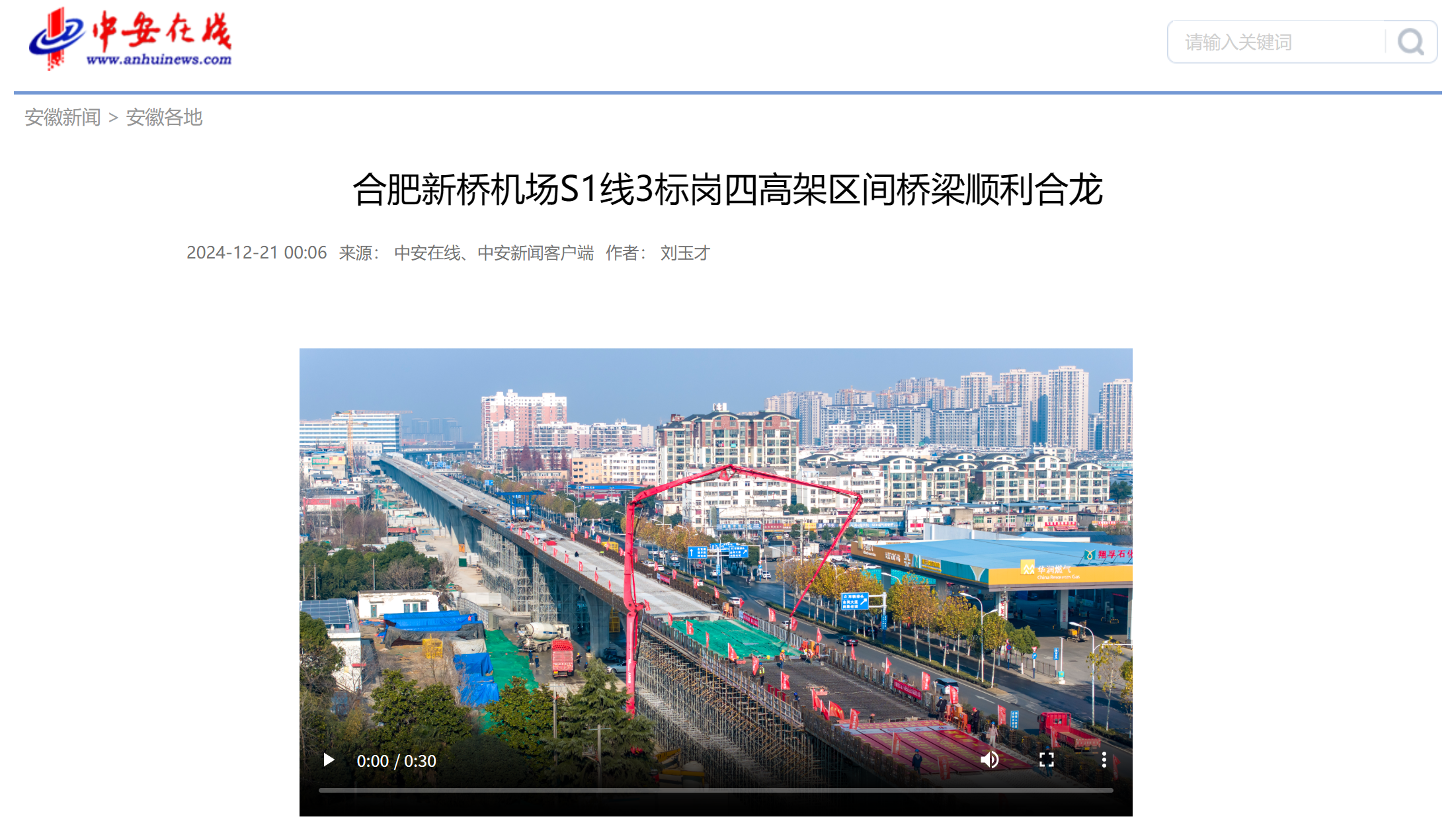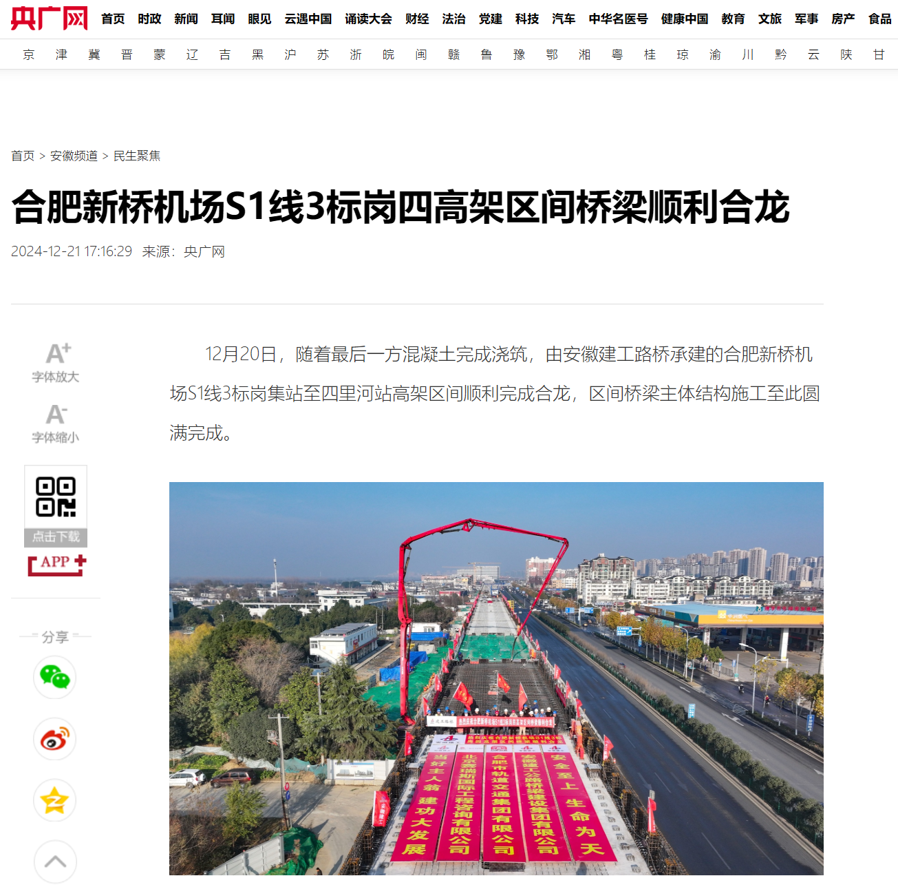 【名媒聚焦】央廣網(wǎng)、安徽日?qǐng)?bào)、中安在線等主流媒體聚焦報(bào)道合肥新橋機(jī)場(chǎng)S1線3標(biāo)崗四高架區(qū)間橋梁合龍