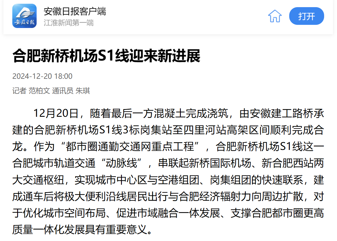 12月20日,隨著最后一方混凝土完成澆筑,由安徽建工路橋承建的合肥新橋機(jī)場(chǎng)S1線3標(biāo)崗集站至四里河站高架區(qū)間順利完成合龍,區(qū)間橋梁主體結(jié)構(gòu)施工至此圓滿完成。