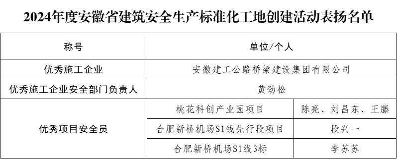 近日,安徽省建設(shè)工程與質(zhì)量安全協(xié)會(huì)發(fā)布表?yè)P(yáng)通知,公司榮獲“2024年度安徽省建筑安全生產(chǎn)標(biāo)準(zhǔn)化工地優(yōu)秀施工企業(yè)”稱號(hào),公司安全環(huán)保部黃勁松同志榮獲“2024年度安徽省建筑安全生產(chǎn)標(biāo)準(zhǔn)化工地優(yōu)秀施工企業(yè)安全部門負(fù)責(zé)人”稱號(hào),桃花科創(chuàng)產(chǎn)業(yè)園項(xiàng)目、合肥新橋機(jī)場(chǎng)S1線先行段項(xiàng)目、S1線3標(biāo)等3個(gè)項(xiàng)目安全管理人員榮獲“優(yōu)秀項(xiàng)目安全員”稱號(hào)。