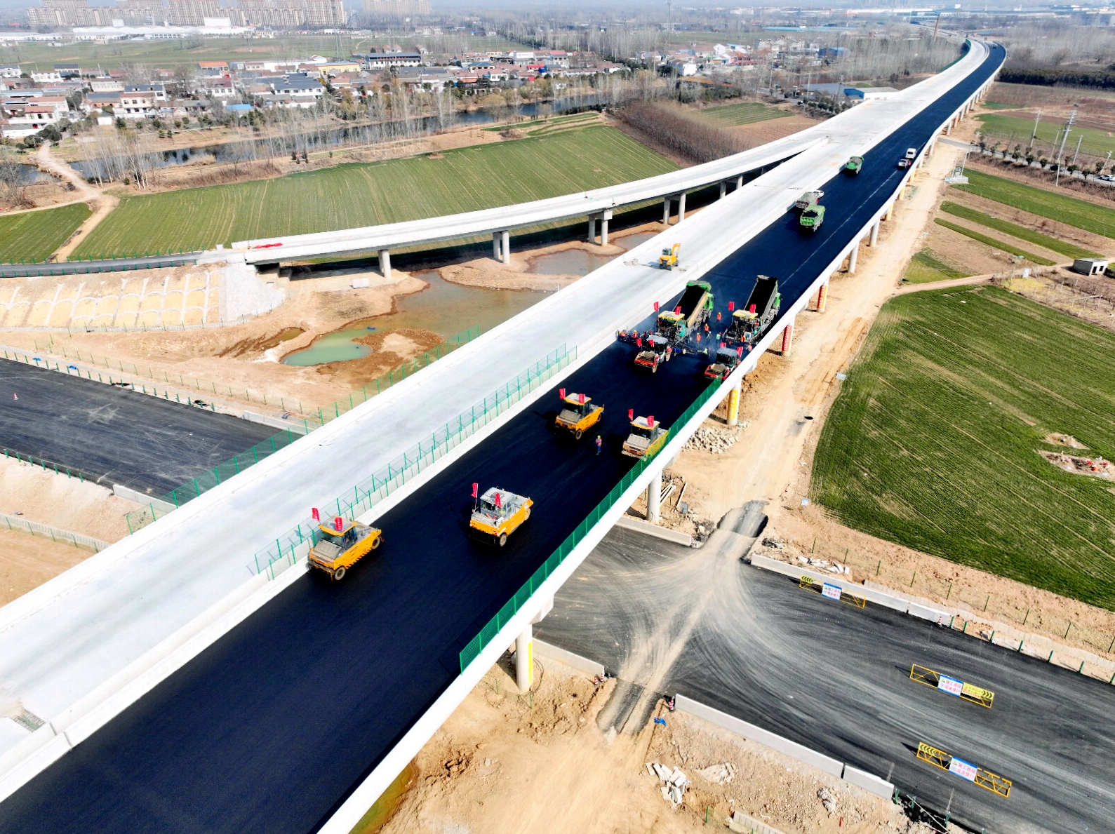 在徐淮阜高速淮北段,項(xiàng)目錨定7月通車目標(biāo),堅(jiān)持節(jié)假日施工“不斷檔”,順利完成全線水穩(wěn)攤鋪施工,正加速推進(jìn)瀝青路面施工。