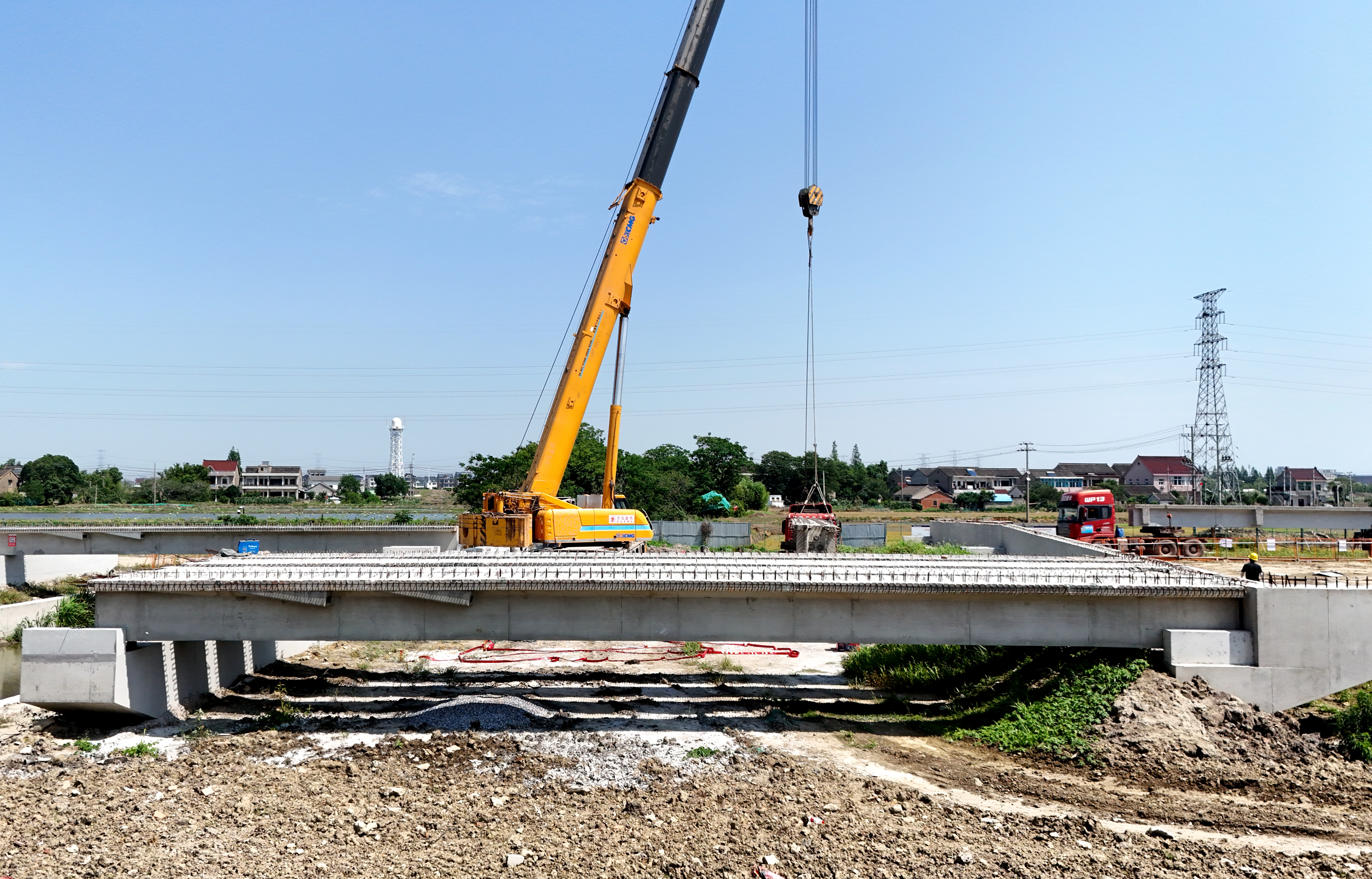 此次架設(shè)的T梁重約40噸。從運(yùn)輸路線勘察到吊裝設(shè)備調(diào)試,項(xiàng)目部實(shí)施“預(yù)警車引導(dǎo)+交通協(xié)管”雙重保障措施,并制定專項(xiàng)施工方案,開展專項(xiàng)技術(shù)交底、模擬演練,確保了首片T梁的安全運(yùn)輸及精準(zhǔn)安裝。