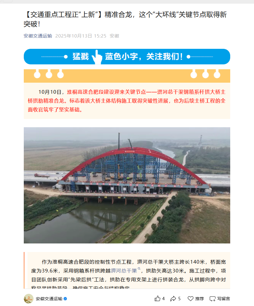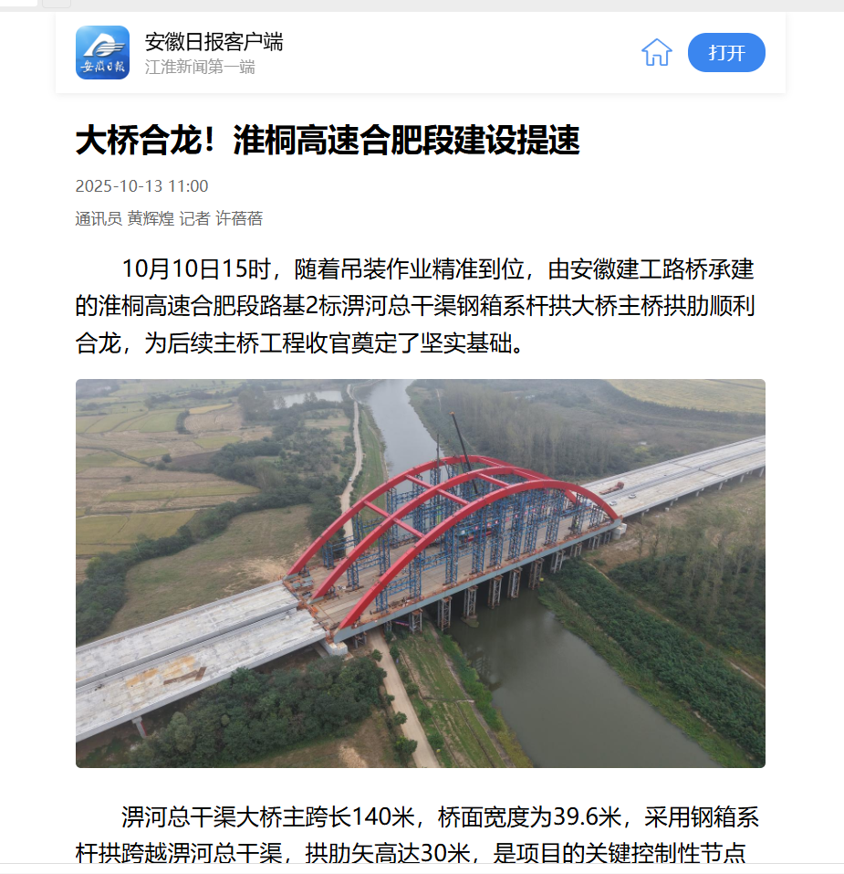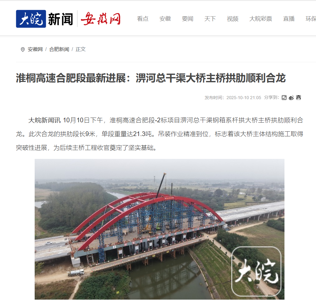近日,央廣網(wǎng)、安徽日?qǐng)?bào)、安徽交通運(yùn)輸、大皖新聞等主流媒體聚焦報(bào)道淮桐高速合肥段路基2標(biāo)淠河總干渠大橋拱肋合龍。