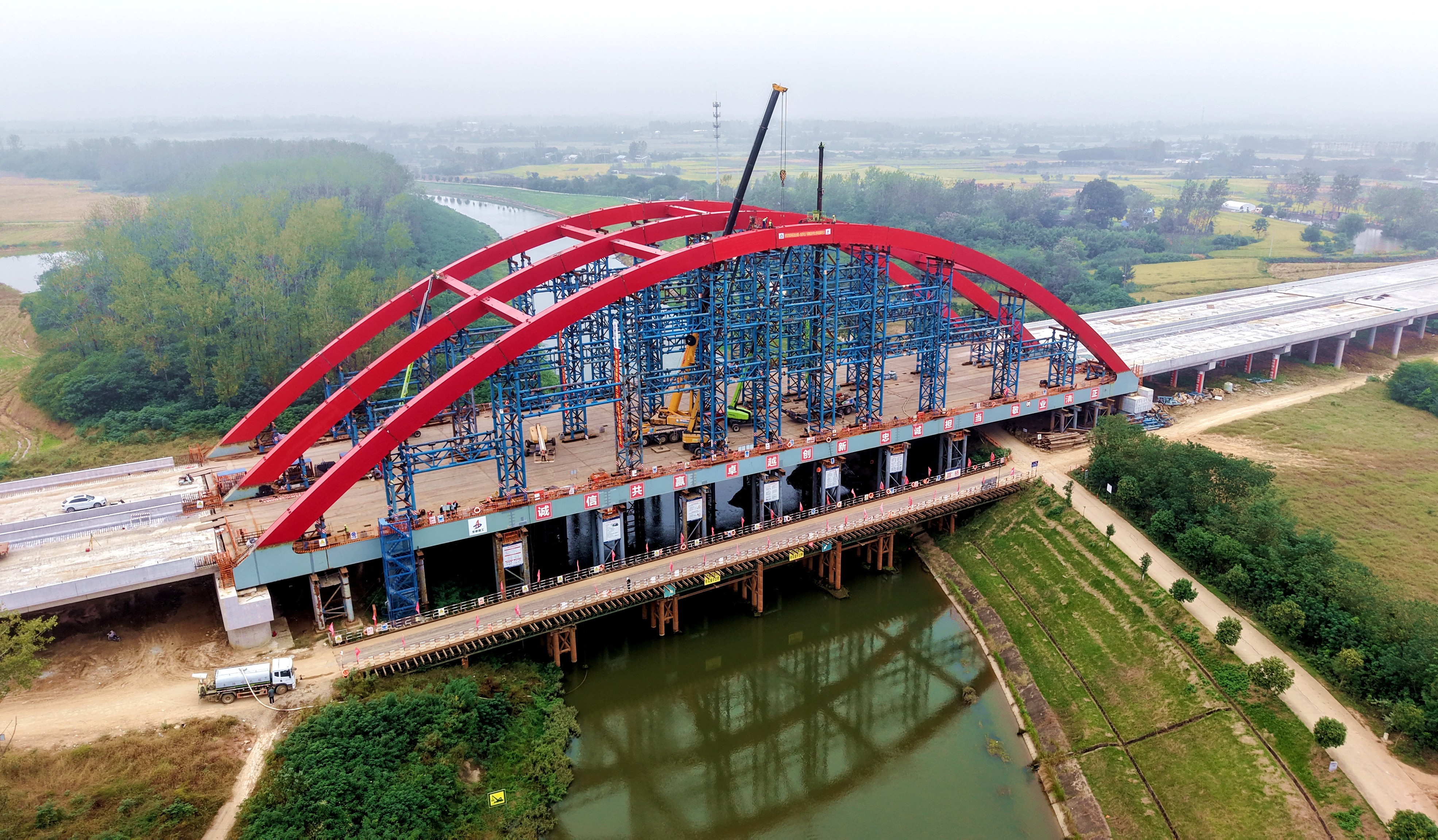 淠河總干渠大橋是項(xiàng)目關(guān)鍵控制性工程之一,主跨長(zhǎng)140米,橋面寬39.6米,采用先梁后拱法施工。此次合龍的拱肋段長(zhǎng)9米,單段重量達(dá)21.3噸,隨著吊裝作業(yè)精準(zhǔn)到位,標(biāo)志著該大橋主體結(jié)構(gòu)取得突破性進(jìn)展,為后續(xù)工程收官奠定基礎(chǔ)。施工中項(xiàng)目部緊緊圍繞質(zhì)量、安全、環(huán)保等目標(biāo),結(jié)合溫度監(jiān)測(cè)合龍口參數(shù),選擇適宜時(shí)段實(shí)現(xiàn)高精度合龍。