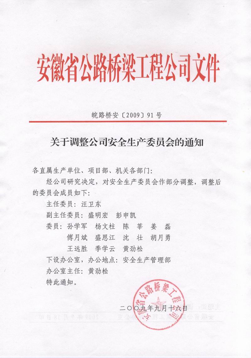 關(guān)于調(diào)整公司安全生產(chǎn)委員會(huì)的通知