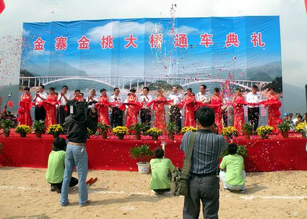 金寨縣委書記沙洪虎在講話中高度贊揚了我公司講政治、重大局、作奉獻(xiàn)的精神。省公路局秦勤局長在代表梅勁廳長的講話中指出,金桃大橋的建成具有極為重要的政治、經(jīng)濟意義,大橋在施工中填補了省內(nèi)橋梁施工技術(shù)的數(shù)項空白,該橋建成后將大大改善當(dāng)?shù)貒?yán)重落后的交通狀況,對促進(jìn)當(dāng)?shù)氐慕?jīng)濟發(fā)展,提高人民群眾生活水平,造福老區(qū)人民具有極其重要的意義。