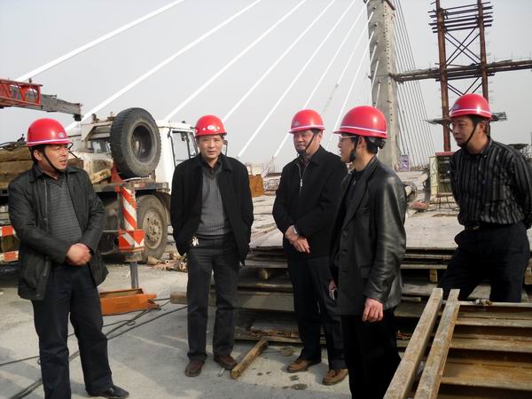 在大橋主跨施工現(xiàn)場,項目經理江仲明向戴總一行詳細匯報了工程質量、進度、安全控制情況。戴總對我部當前的工程進展情況表示滿意,希望我部再接再厲,特別是在工程收尾階段不能松懈,要一如既往的做好各項工作,繼續(xù)加強文明施工,扎實推進項目精細化管理。