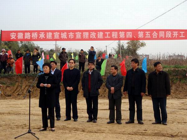11月28日上午,在宣貍路改建工程第五合同段K34+740施工現(xiàn)場(chǎng)響起了歡快的鞭炮聲,鮮艷的彩旗熱情地歡迎四方賓朋,宣貍路改建工程第四、第五合同段開(kāi)工儀式隆重舉行。出席儀式的有宣城市交通局總工程師、建委副主任夏志海、宣州區(qū)副區(qū)長(zhǎng)傅葵、宣州區(qū)交通局局長(zhǎng)胡學(xué)斌、宣州區(qū)宣貍路征遷協(xié)調(diào)組副組長(zhǎng)江國(guó)平、貍橋鎮(zhèn)書(shū)記楊承保、貍橋鎮(zhèn)鎮(zhèn)長(zhǎng)時(shí)國(guó)全、總監(jiān)代表邱旭光、駐地柏玉坤、安徽省路橋公司黨委書(shū)記陳光磊、副總經(jīng)理盛明宏以及朱橋和沈村鄉(xiāng)鎮(zhèn)領(lǐng)導(dǎo)、沿線村委會(huì)代表、村民代表等相關(guān)人員。