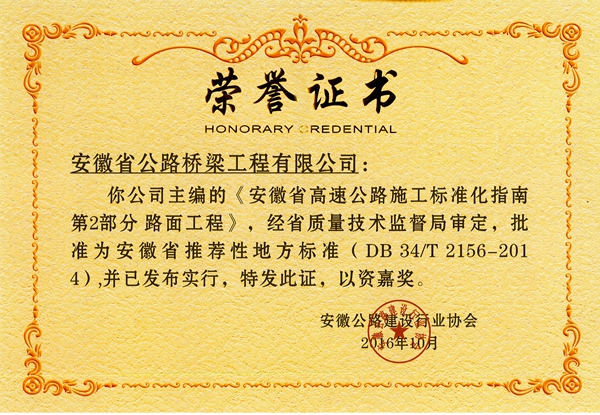 會上,省交通廳對在系列指南編寫工作中作出貢獻的單位和個人給予了表彰并頒發(fā)榮譽證書。公司主編的 《安徽省高速公路施工標(biāo)準化指南 第2部分路面工程》(DB 34/T 2156-2014)獲得表彰,并經(jīng)省質(zhì)量技術(shù)監(jiān)督局審定批準為安徽省推薦性地方標(biāo)準,發(fā)布實行。