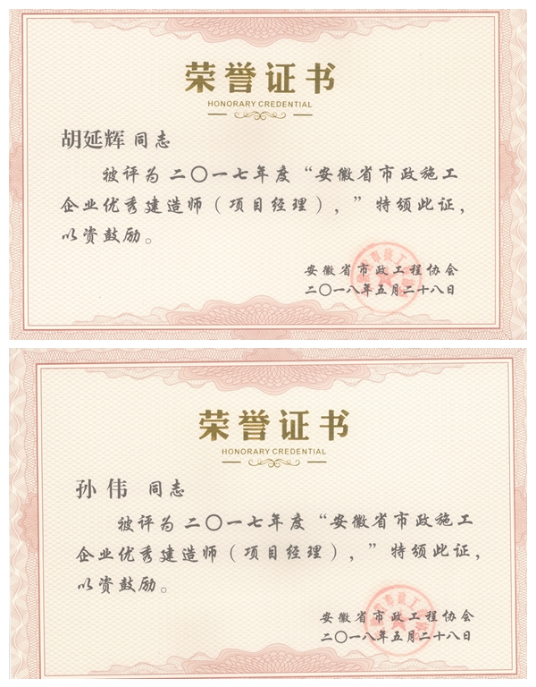 近日,從安徽省市政工程協(xié)會(huì)傳來(lái)喜訊,公司榮獲2017年度安徽省“優(yōu)秀市政施工企業(yè)”榮譽(yù)稱號(hào),錢申春、胡延輝、孫偉三位同志榮獲2017年度安徽省“市政施工企業(yè)優(yōu)秀建造師”榮譽(yù)稱號(hào)。