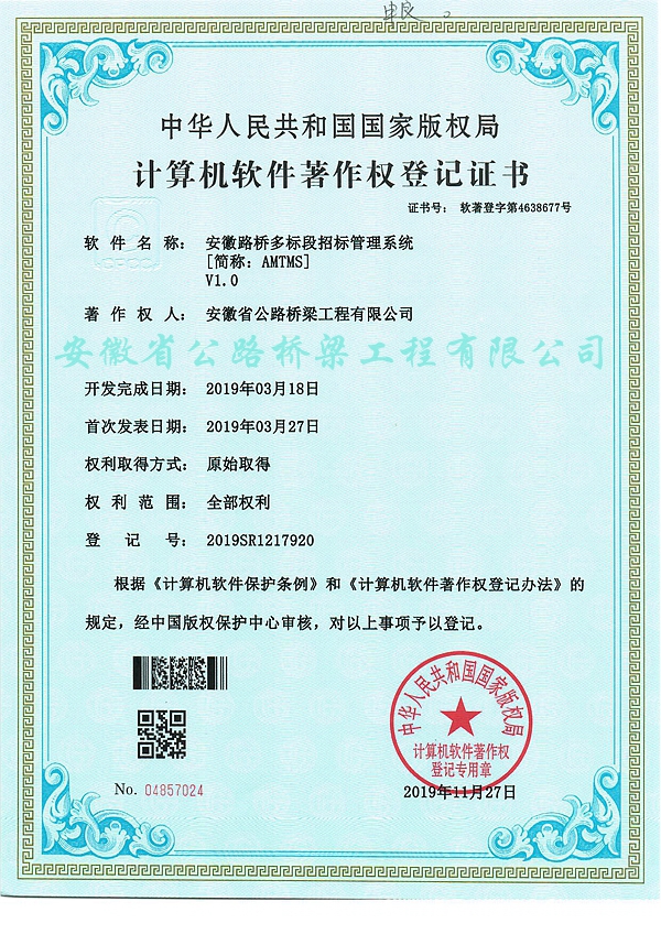 近日,《安徽路橋多標段招標管理系統(tǒng)V1.0》《安徽路橋關(guān)鍵績效考核管理系統(tǒng)V1.0》等五項管理系統(tǒng)取得國家版權(quán)局頒發(fā)的計算機軟件著作權(quán)。