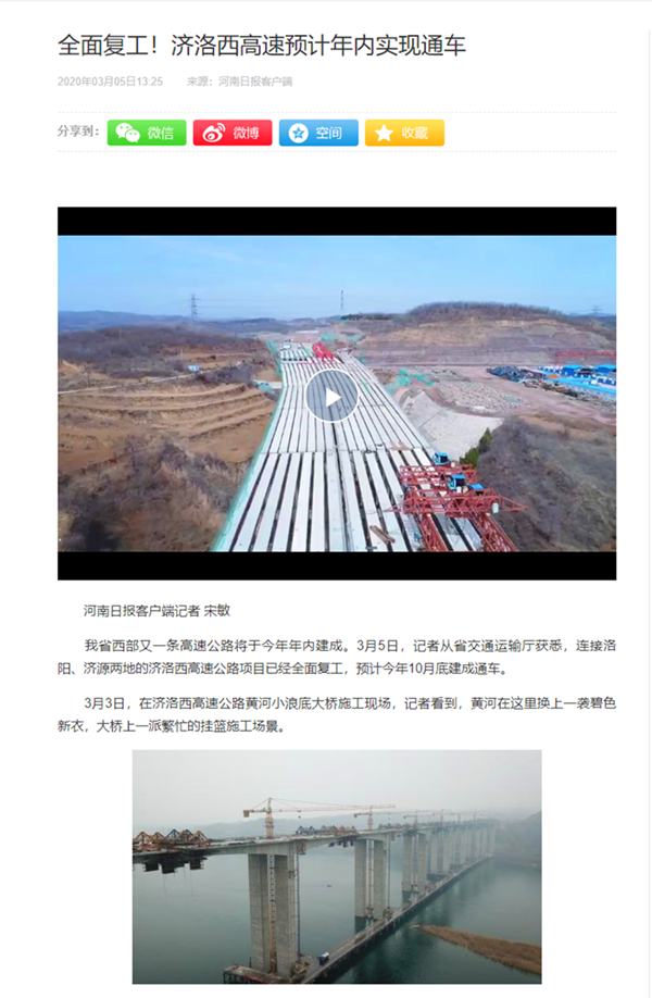 3月4日,公司承建的巢湖亞父路項(xiàng)目裕溪河大橋復(fù)工場景出現(xiàn)在人民網(wǎng)首頁,并刊文指出,為奪回疫情造成的停工損失,項(xiàng)目部嚴(yán)格落實(shí)防疫和生產(chǎn)要求,在保證安全質(zhì)量的前提下,加班加點(diǎn)趕施工進(jìn)度,確保大橋按期建成通車。河南衛(wèi)視、鳳凰網(wǎng)等多家媒體記者走進(jìn)公司承建的濟(jì)洛西高速黃河特大橋項(xiàng)目施工現(xiàn)場,實(shí)地采訪項(xiàng)目復(fù)工復(fù)產(chǎn)情況,并在中國網(wǎng)、河南日?qǐng)?bào)客戶端、大河網(wǎng)進(jìn)行了登載。安徽網(wǎng)聚焦G318池州至殷匯段改建工程復(fù)工建設(shè),《今日宣州》以《按下交通建設(shè)“快進(jìn)鍵”》為題專題報(bào)道了公司宣城PPP項(xiàng)目在疫情防控形勢逐漸向好的態(tài)勢下,搶抓建設(shè)黃金期,優(yōu)化調(diào)整復(fù)工隊(duì)伍和施工組織計(jì)劃,把因疫情耽誤的工期搶回來,確保項(xiàng)目如期完工,開啟了復(fù)工建設(shè)趕進(jìn)度模式。