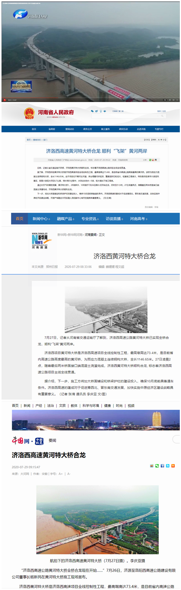 7月26日至27日,中新社、河南衛(wèi)視、河南日報、東方今報等多家省部級主流媒體,深入濟洛西高速黃河特大橋施工現(xiàn)場,現(xiàn)場采訪并共同見證了目前河南省內(nèi)墩高最高的黃河特大橋合龍。