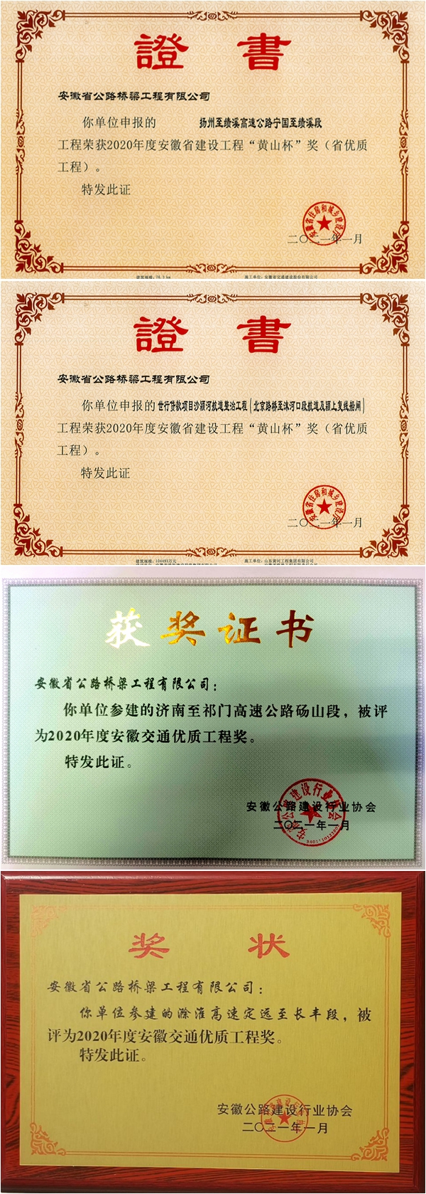 近日,2020年安徽省建設(shè)工程“黃山杯”和2020年度安徽交通優(yōu)質(zhì)工程獎在合肥頒獎。公司承建的揚績高速公路寧國至績溪段路基07標、沙潁河航道(北京路橋至沫河口段航道及潁上復(fù)線船閘)整治工程06標榮獲2020年安徽省建設(shè)工程“黃山杯”。滁淮高速公路定遠至長豐段路基05標、路面02標,濟祁高速碭山段項目榮獲2020年度安徽交通優(yōu)質(zhì)工程獎。