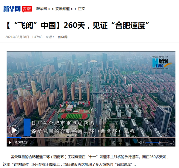 8月28日,國家級(jí)主流媒體再次聚焦公司承建的重點(diǎn)工程建設(shè),《新華網(wǎng)》以《“飛閱”中國260天 見證“合肥速度”》為題,報(bào)道了公司承建的暢通南二環(huán)(西南環(huán))項(xiàng)目建設(shè)進(jìn)展情況。