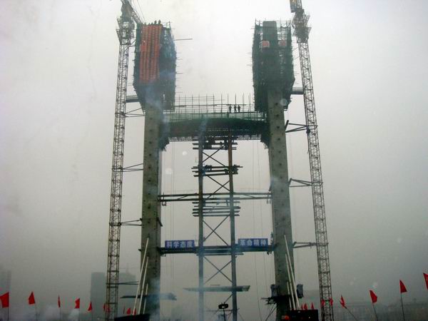 作為整座大橋的控制性工程,主索塔施工一直是各方關(guān)注的焦點,并成為影響我項目總體施工進度的主要因素。為此,項目部領(lǐng)導(dǎo)班子經(jīng)過多次研究分析并大膽決策,決定改變以前多點開花,齊頭并進的工作方向,將工作重心向主索塔偏移,從人員到設(shè)備優(yōu)先滿足主索塔的施工需要。針對施工過程中遇到的技術(shù)難題,項目部及時邀請有關(guān)專家及公司領(lǐng)導(dǎo)到施工現(xiàn)場指導(dǎo),制定解決方案。在積極趕超進度的同時,項目部將安全和質(zhì)量擺放在首要位置。在施工過程中,項目部不僅建立了完善的安全、質(zhì)量保障體系,更積極增加投入,全方位確保主索塔施工質(zhì)量,并使主索塔施工速度得到穩(wěn)步提升。
