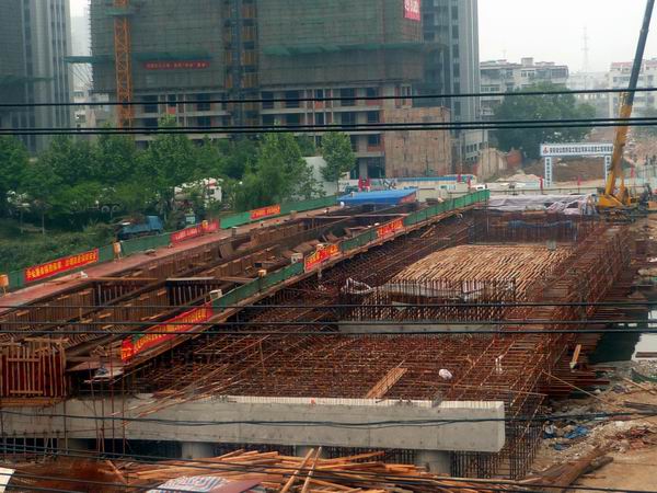 宋斗灣路工程跨南淝河橋在3月30日左半幅鋼管樁打設(shè)完畢后,就開始著手進行貝雷架和支架搭設(shè)作業(yè)。在左半幅支架搭設(shè)、模板鋪裝和鋼筋安裝施工的同時,跨南淝河橋右半幅的鋼管樁打設(shè)作業(yè)和支架搭設(shè)作業(yè)也初步完工。至此,宋斗灣路工程跨南淝河橋的上部結(jié)構(gòu)的支架搭設(shè)基本完工。下一步,箱梁內(nèi)膜安裝結(jié)束后,項目部將組織橋梁主體混凝土澆注工作。