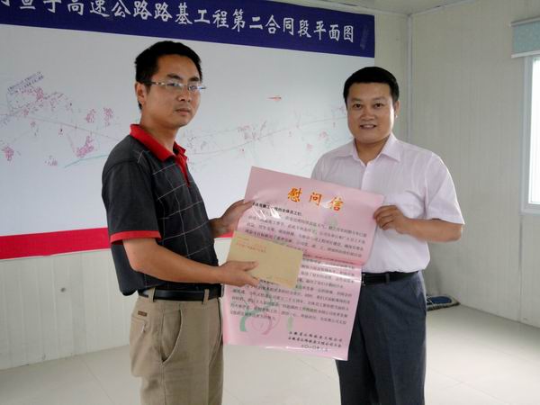胡主席一行在到達項目部后,首先召集了項目部領導及部分技術骨干在會議室召開了一個簡單的座談會。會上,胡主席代表公司領導首先對02標項目部的五十多名干部職工傳達了公司領導的關懷:“季節(jié)特殊,條件艱苦,同志們辛苦了!”隨后,胡主席向王守武總工遞交了總公司工會給宣寧02標項目職工的慰問信及慰問金,總工王守武代表項目部全體員工對總公司的慰問表示感謝。