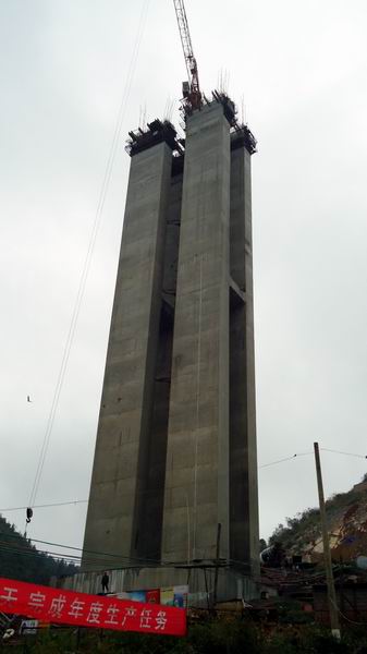 巖子腳特大橋為連續(xù)性剛構橋,兩主墩之間跨度160米。主橋左、右幅均為混凝土連續(xù)箱梁,是水盤線幾個重點控制工程之一,也是影響我項目工期的關鍵性工程。該橋主體橋墩都有4根墩柱,高度均超過58米,此次完成封頂的主橋4號墩是迄今為止我公司施工過的最高橋墩。