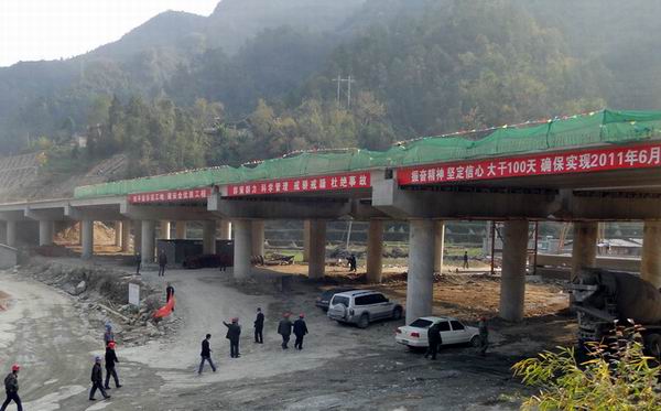 王家溝大橋設(shè)計為8孔20米,橋梁全長170.08米,共8跨28根立柱,144塊梁板,上部構(gòu)造為20米跨徑預(yù)應(yīng)力空心板,下部構(gòu)造橋墩為柱式敦、樁基礎(chǔ),橋臺為u型臺擴基、柱式臺樁基。從2009年12月份開始樁基挖空施工,克服了挖孔巖石堅硬、反復滲水的地質(zhì)困難,經(jīng)受住7月15日特大洪水和8月6日龍卷風考驗,順利于6月份完成立柱施工,8月開始進行橋臺施工,9月6日開始梁板架設(shè)。在梁板架設(shè)的同時,橋面連接施工也已經(jīng)展開,截止11月8日,橋面連接施工只剩下最后一跨。
