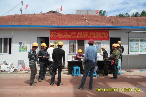 上午10時(shí)半左右,贛州高速公司安監(jiān)辦劉主任、項(xiàng)目辦綜合處李處長(zhǎng)等業(yè)主單位領(lǐng)導(dǎo)來(lái)我標(biāo)段現(xiàn)場(chǎng),指導(dǎo)檢查安全月咨詢活動(dòng)開展情況,并接受現(xiàn)場(chǎng)工人有關(guān)安全生產(chǎn)知識(shí)的咨詢。在對(duì)我標(biāo)段安全生產(chǎn)月咨詢活動(dòng)開展情況表示贊許的同時(shí),劉主任一行也提出了要求,希望我部采取多種形式開展安全生產(chǎn)宣傳教育工作,使一線工人明確自己的權(quán)利、義務(wù),掌握施工安全知識(shí)和技能。