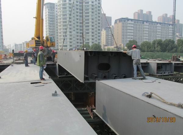 回顧跨南淝河橋鋼箱梁的施工過(guò)程,項(xiàng)目全體員工共同努力,克服了許多技術(shù)和吊裝難題。工程前期現(xiàn)場(chǎng)勘查發(fā)現(xiàn),橋梁東側(cè)位于現(xiàn)狀110kv高壓線下,河南岸的東側(cè)和西側(cè)分別有高壓鐵塔和污水泵站,大噸位吊車無(wú)法滿足安全施工條件。項(xiàng)目部技術(shù)人員根據(jù)橋型特點(diǎn)和場(chǎng)地特殊環(huán)境、設(shè)備要求, 上報(bào)設(shè)計(jì)單位將原設(shè)計(jì)20+30+20m三個(gè)制作段架設(shè)變更為16+10+18+10+16m五段架設(shè),并通過(guò)專家論證評(píng)審,解決了關(guān)于鋼箱梁架設(shè)存在的重要疑難。后期架設(shè)時(shí)為了確保吊裝100%安全,杜絕安全隱患,通過(guò)項(xiàng)目部與多方努力協(xié)調(diào),在10月20日架設(shè)東側(cè)110kv高壓線下鋼箱梁時(shí),高壓線暫停供電。全力做到放心安全的架好每一片梁。